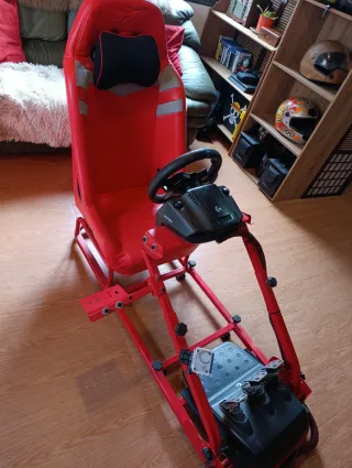 Cockpit de simracing en color rojo,el estado es muy bueno, casi nuevo, se ha usado muy poco, la silla y la estructura es de la marca FK alemana de productos de carreras , el volante es un Logitech g923 con poco uso, lo compre hace menos de dos años ,los cables estan enfundados para mas portabilidad y comodidad , listo para conectar y disfrutar, motivo de la venta es el espacio, no tengo sitio donde vivo ahora y me estorba bastante.No se hacen envios!