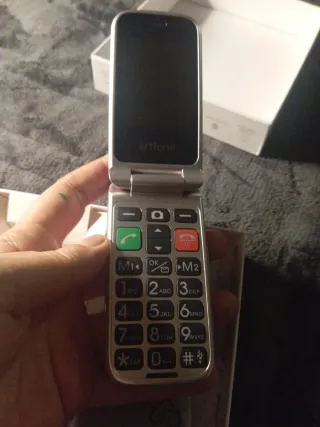 Teléfono móvil abatible de la marca Artfone. Diseño clásico y fácil de usar. - Pantalla principal. - Teclado numérico grande. - Botones de llamada y finalización de llamada. - Botones de acceso rápido M1 y M2.