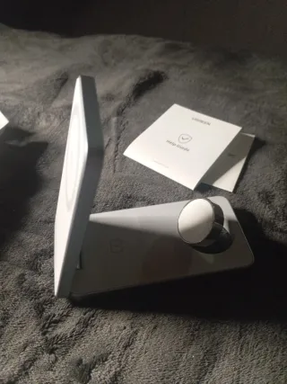 Estación de carga para auriculares con función de despertador. Permite cargar tus auriculares de forma inalámbrica y configurar alarmas. - Carga inalámbrica de auriculares. - Función de despertador con alarma. - Pantalla digital para estado.