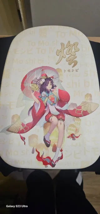 Estuche para gafas de realidad virtual con un diseño de anime. - Estampado de personaje femenino. - Colores predominantes: blanco, rojo y dorado.