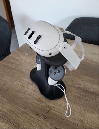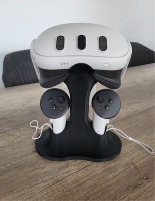 Soporte para tus gafas de realidad virtual y mandos. - Compatible con Meta Quest 3 , 3s y Meta Quest 2. - Mantiene tus dispositivos organizados y listos para usar.