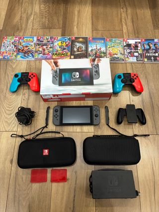 Consola Nintendo Switch completa con todos sus accesorios y una gran selección de juegos. - Consola Nintendo Switch - Joy-Con (izquierdo y derecho) - Base de carga - Adaptador de corriente - Agarre para Joy-Con - Funda de transporte - Juegos incluidos: Just Dance 2021, CTR, Mario Kart 8 Deluxe, ARMS, Sphinx, Sports Party, Battle for Bikini Bottom, FIFA 21, FIFA 19