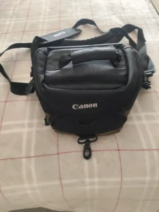 Cama canon + objetivo + Funda para cámara Canon en color negro. Diseñada para proteger tu equipo. - Correa ajustable para el hombro. - Asa superior para un agarre cómodo. - Cierre de cremallera. - Incluye mosquetón.