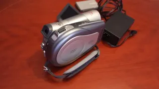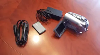 Videocámara Canon con acabado plateado y detalles en negro. Incluye su cargador y correa. - Modelo con capacidad para DVD. - Pantalla LCD abatible. - Correa de mano ajustable.
