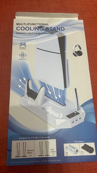 Base de carga multifuncional para consola PS5. - Diseñada para los modelos PS5 Slim y Standard. - Incluye ventiladores para refrigeración. - Capacidad para cargar mandos. - Soporte vertical para la consola. - Incluye un colgador para auriculares. -Funda plateada vertical.