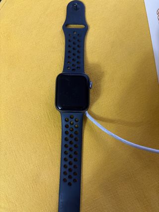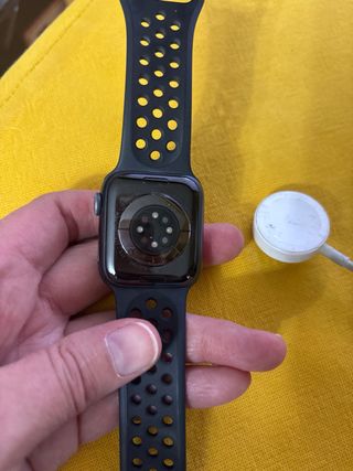 Reloj inteligente Apple Watch Serie 6 de 44mm. Diseño elegante y moderno. Funciona perfectamente todo. Pequeño arañazo en la pantalla según se ve en foto. No otros golpes. Batería en buen estado. Varias correas disponibles. Con el cable y sin cargador. Con caja original. - Caja de aluminio. - Correa deportiva perforada. - Pantalla Retina. - Resistencia al agua.