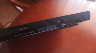 Reproductor de DVD en color negro, con diseño moderno y compacto. - Puertos USB y lector de tarjetas. - Compatible con formatos DVB, Dolby Digital, HDCD y MPEG4. Funcionaba pero se rompió el mando ,Desconozco si funciona , no devolución