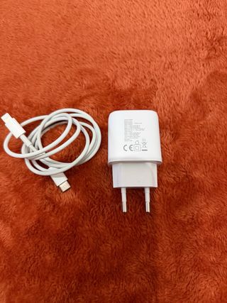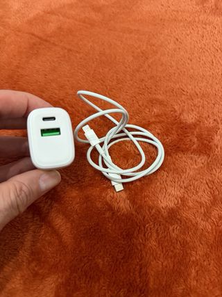 Cargador blanco con puerto USB-C y cable Lightning. - Incluye adaptador de corriente. - Cable Lightning para dispositivos Apple.