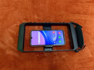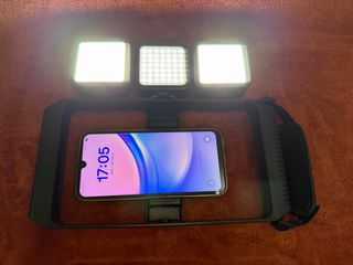 Kit de iluminación para video y fotografía con soporte para smartphone. Ideal para crear contenido de calidad. - Marco negro. - Soporte ajustable para móvil. - Asa lateral con correa. -2 focos led recargables usb-c ajustables intensidad . - 1 foco a pilas no ajustable la intensidad.