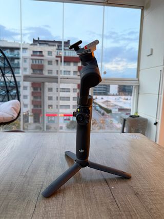 Estabilizador de mano para móviles. - Diseño plegable y compacto. - Mango ergonómico para un agarre cómodo. - Mecanismo de liberación rápida para el teléfono.
