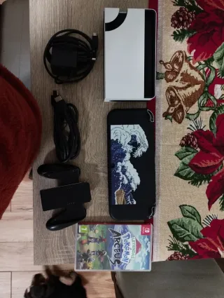 Consola Nintendo Switch OLED en color blanco y negro, junto con sus accesorios. - Base de carga para Joy-Con. - Adaptador de corriente. - Cable HDMI. - Juego Pokémon Legends: Arceus. - Protector. - Memoria.