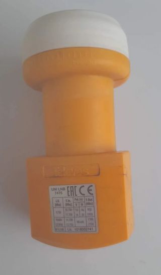 LNB para antena parabólica de la marca Feleves, modelo 7475. - Frecuencia de entrada (LO): 9750 MHz. - Frecuencia de entrada (HI): 10700 - 11700 MHz. - Polarización Vertical: 12 - 16 V. - Polarización Horizontal: 14 - 20 V. - Frecuencia de salida: 950 - 1950 MHz. - Consumo: 90 mA. - Número de serie: 1018002141.