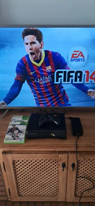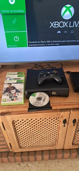 Consola Xbox 360 Slim en color negro. Incluye mando y varios juegos. - Mando inalámbrico. - Juegos incluidos: FIFA 14,FIFA World Brasil 2014.Rugby World Cup 2015.
