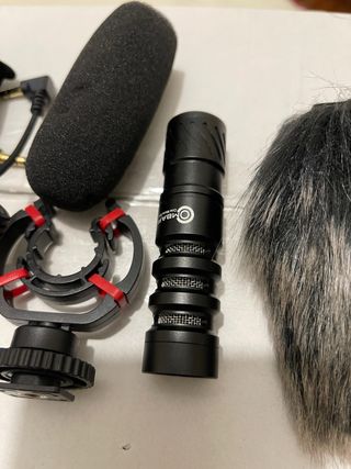 Micrófono direccional de alta calidad para cámaras profesionales. - Diseño compacto y ligero. - Incluye antiviento de espuma y peludo. - Soporte antivibración con montura para zapata. - Construcción robusta en aluminio.