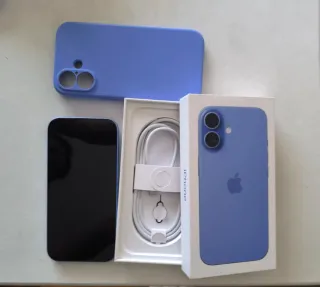 Teléfono móvil iPhone 16 en color azul. - Funda protectora azul. - Tiene garantía todavía - Cable de carga.