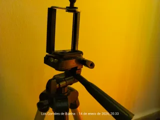 Trípode fotográfico plateado con soporte para móvil. - Patas extensibles para ajustar la altura. - Cabezal giratorio para diferentes ángulos. - Ligero y fácil de transportar. -ALTURA DE 1 METRO CON 20 CM -