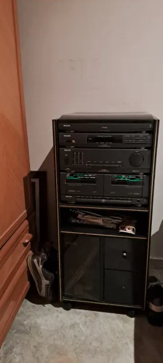 Sistema de sonido Philips con varios componentes. - Diseño elegante en color negro y detalles marrones. - Incluye reproductor de CD y doble pletina de cassette.