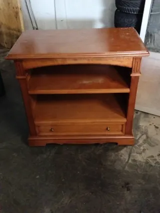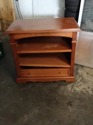 Mueble de madera con un diseño clásico, ideal para colocar tu televisión y otros aparatos electrónicos. - Dos estantes abiertos. - Un cajón con tiradores dorados. - Acabado en tono madera cálido.