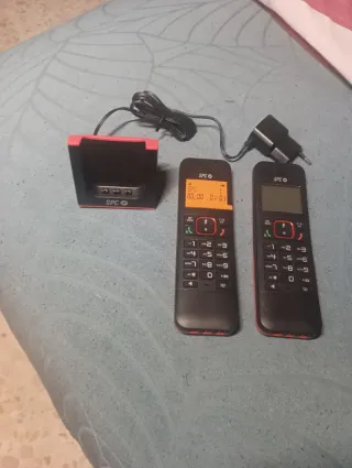 Teléfono inalámbrico SPC con su base de carga y adaptador. - Base de carga negra y roja. - Teléfono con teclado numérico. - Pantalla con información básica.