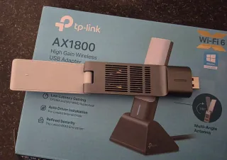 Adaptador USB de alta ganancia para Wi-Fi 6. Solo caja y pincho, no dispongo del cable prolongado. - Velocidad ultra-rápida de 1201 Mbps + 574 Mbps. - Tecnología Low-Latency OFDMA. - Driver automático pre-cargado. - Seguridad WPA3. - Antena multi-ángulo.