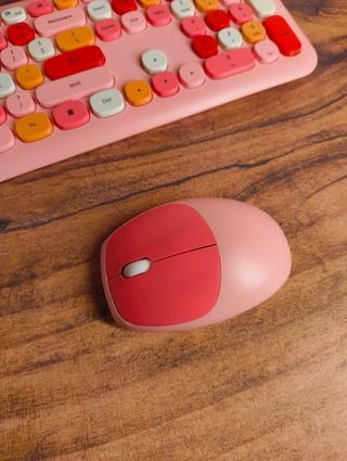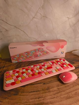 Conjunto de teclado y ratón inalámbricos con un diseño colorido y alegre. - Teclas redondas de estilo retro. - Acabado en color rosa con detalles multicolores en las teclas. - Incluye ratón a juego.