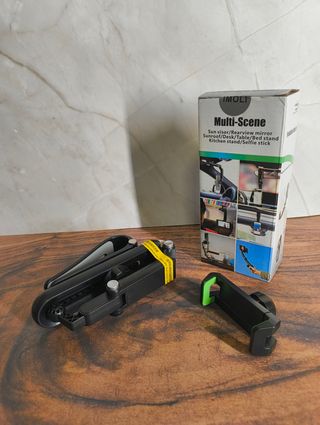 Soporte versátil para tu móvil, ideal para múltiples usos. - Diseñado para visera, espejo retrovisor, techo solar y como palo selfie. - Marca IMOLI.