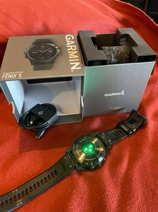 Reloj deportivo Garmin Fenix 5 en color negro. Incluye su caja original y cable de carga. - Pantalla circular. - Correa de silicona. - Bisel metálico. Presenta marcas de uso en el bisel propias del uso, visibles en las fotos. Pantalla minimamente rallada, se puede apreciar en la foto y funcionamiento perfecto.