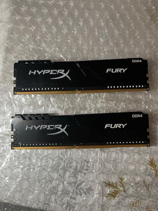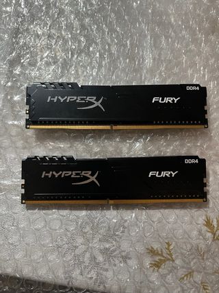 Módulos de memoria RAM DDR4 HyperX Fury de 8GB cada uno, con una velocidad de 2666MHz. - Capacidad: 8GB por módulo. - Tipo de memoria: DDR4. - Velocidad: 2666MHz. - Diseño: Negro con logo HyperX y FURY Sin caja pero estan si usar