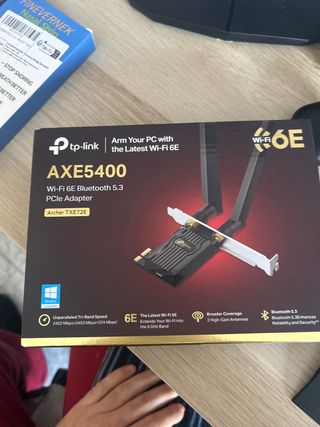 Adaptador PCIe Wi-Fi 6E y Bluetooth 5.3 de TP-Link. - Velocidad Tri-Band sin precedentes: 2402 Mbps + 2402 Mbps + 574 Mbps. - Extiende tu Wi-Fi hasta la banda de 6 GHz. - Cobertura más amplia con 2 antenas de alta ganancia. - Bluetooth 5.3 para mayor fiabilidad y seguridad. Nuevo nuevecisto nuevo