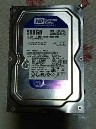 Disco duro interno de 500 GB de la marca Western Digital. - Modelo: WD5000AAKX - Capacidad: 500 GB - Interfaz: SATA - Caché: 16MB - Fabricado en abril de 2011.
