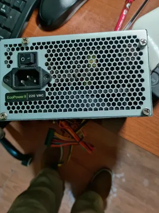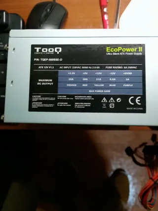 Fuente de alimentación para ordenador de la marca TOOQ, modelo EcoPower II. - Potencia máxima de 500W. - ATX 12V V1.3. - Entrada AC: 220VAC 50/60 Hz 2.5-5A. - Fusible: 6A 250VAC. - Salidas DC: +3.3V (28A), +5V (30A), +12V (21A), -12V (0.5A), +5VSB (3A). - Fabricada en China.