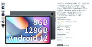Vendo TECLAST M40 Pro en perfecto estado, funcionando perfectamente. Pantalla de 10.1”, ideal para YouTube, Netflix, estudio, navegación y uso diario. ✅ Especificaciones principales Modelo: TECLAST M40 Pro RAM: 6 GB Almacenamiento: 128 GB Batería: 7000 mAh Pantalla: 10.1” FHD (1920x1200) Conectividad: 4G LTE, WiFi, Bluetooth, GPS SIM dual + microSD ✅ Incluye Tablet Caja original Cargador Cable USB-C Manuales/documentación + Regalo funda con teclado externo ✅ Estado Muy cuidada (ver fotos reales) Sin bloqueos ni cuentas Lista para usar 📦 Envío rápido y bien protegido o entrega en mano en Sevilla