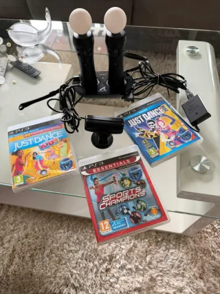 Pack de juegos y accesorios para PlayStation 3. - Juego Just Dance Kids. - Juego Just Dance. - Juego Sports Champions. - Controladores PlayStation Move. - Cámara PlayStation Eye. - Adaptador de corriente.