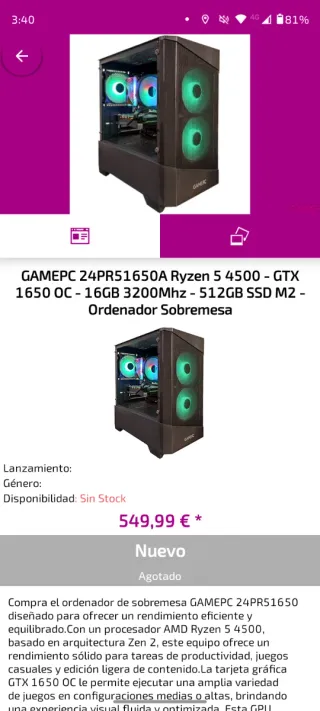 Ordenador de sobremesa GAMEPC con procesador AMD Ryzen 5 4500 y tarjeta gráfica GTX 1650 OC. - 16GB de RAM DDR4 a 3200MHz. - SSD M.2 de 512GB. - Diseño con iluminación LED. Tiene menos de 1 año de uso es perfecto para guejos sencillos como: Fortnite que va a más de 165 fps Warzone a 100fps