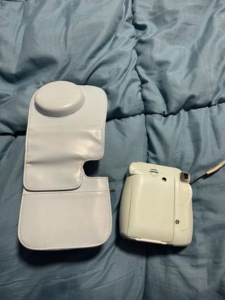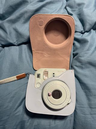 Cámara instantánea Fujifilm Instax Mini 9 en tonos rosa y azul, con su funda protectora. - Incluye funda de cuero rosa para la parte superior. - Funda de cuero azul para el cuerpo de la cámara. - Correa de mano a juego.