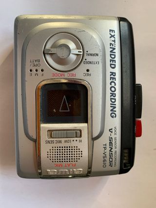 Grabadora de voz Aiwa TP-VS610 con tecnología V-Sensor. - Función de grabación extendida. - Indicador de nivel de batería. - Selector de sensibilidad del micrófono (HI/LOW). - Botón de REC MODE. Funciona bien con baterías alcalinas
