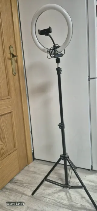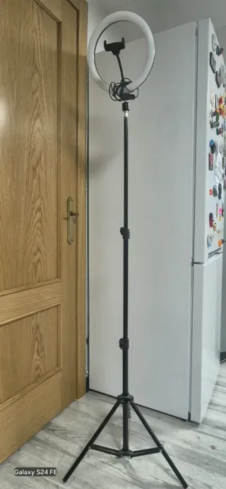 Trípode ajustable en altura con aro de luz y soporte para móvil. - Aro de luz LED circular. - Soporte flexible para smartphone. - Base de trípode estable. Desde 60cm a 180cm