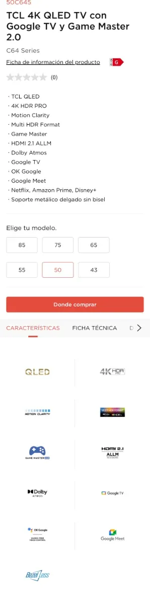 Televisor TCL de 50 pulgadas con tecnología QLED y Google TV. Disfruta de una experiencia visual inmersiva con resolución 4K HDR Pro. - Pantalla QLED de 50 pulgadas. - Sistema operativo Google TV. - Soporte para 4K HDR Pro.