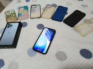 Teléfono móvil iPhone 13 Pro Max con acabado en azul y plata. - Capacidad de almacenamiento de 128 GB. Salud de la batería 🔋 77% Lo doy con cargador, caja y 8 fundas Acepto cambios u ofertas