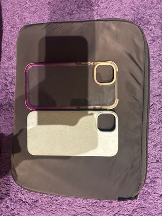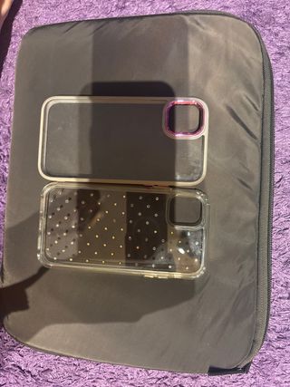 Dos fundas para iPhone 14. - Una funda transparente con detalles de pedrería. - Una funda opaca con borde metálico.