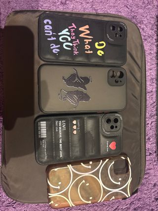 Lote de fundas para iPhone 11 con diferentes diseños. - Funda negra con texto Do What They Think YOU can't do. - Funda gris con diseño de dos figuras. - Funda negra con diseño de código de barras y texto LOVE YOU DESERVE THE BEST LOVE. - Funda transparente con estampado de caritas sonrientes.
