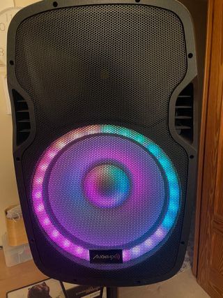 Altavoz profesional de 15 pulgadas con un diseño llamativo y efectos de luz. - Altavoz de 15 pulgadas. - Iluminación LED multicolor integrada en el aro del altavoz. - Rejilla protectora frontal. -Cable de corriente y speakon Si te interesa también tengo el activo 15" USB, Bluethoot y luces led 1200Wtts