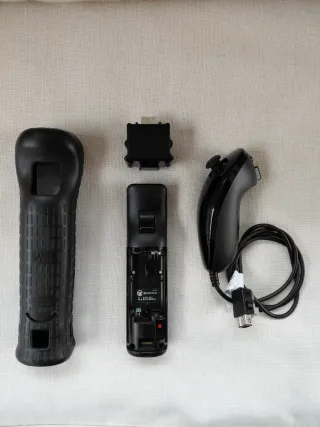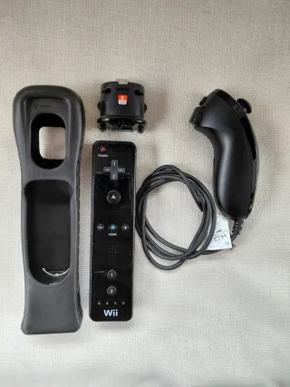 Pack de accesorios para Nintendo Wii en color negro. -Le falta la tapa trasera - Mando Wii con tecnología Motion Plus integrada. - Nunchuk adicional para ampliar las posibilidades de juego. - Funda protectora de silicona para el mando. - Se envía protegido en plastico de burbujas. Cada articulo se limpia antes de su envio. - Agrupa articulos para un descuento. - Envio Inpost 24 horas, correos 72 horas.