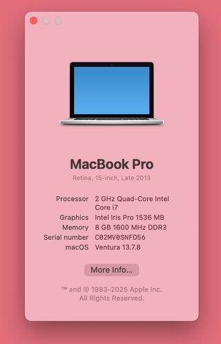 Portátil Apple MacBook Pro de 15 pulgadas, modelo de finales de 2013. Diseño elegante en color plata. - Pantalla de 15 pulgadas. - Teclado retroiluminado. - Trackpad amplio. - Incluye cargador y funda protectora de color gris -Mac Os Ventura + OCLP instalado Pequeño golpe en esquina derecha, y algun pequeño arañazo, se ve todo en las fotos. Todo lo demás en muy buen estado.
