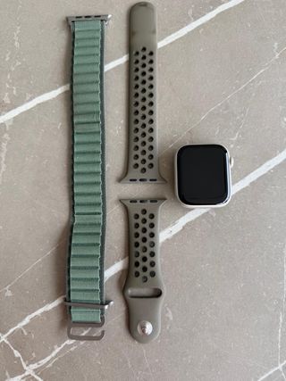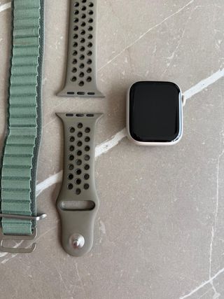 Se vende un Apple Watch+gps celullar series 7 45mm con dos correas intercambiables. Necesita cambiar bateria. Cajas originales. - Correa deportiva perforada en color gris. - Correa de tejido en color verde con cierre de velcro.