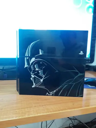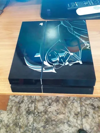 (ENCIENDE Y SE APAGA A LOS 5 MINUTOS,EL LECTOR LE CUESTA TRAGAR Y EXPULSAR EL DISCO) Consola PlayStation 4 modelo Fat con un diseño exclusivo inspirado en Darth Vader. - Diseño negro con detalles en blanco y azul. - Parte superior con arte de Darth Vader.