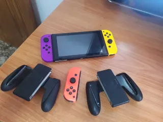 Consola Nintendo Switch con Joy-Cons de colores. - 1 Joy-Con izquierdo en color morado. -2 Joy-Con derecho en color amarillo y otro naranja. - Incluye 3 grips negros para los Joy-Cons. -Tiene cristal templado puesto y doy 2 mas de recambio