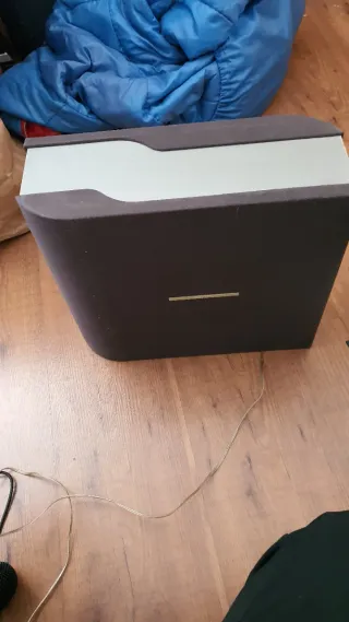 Subwoofer de la marca Philips con un diseño moderno. - Acabado en color beige y marrón. - Puerto bass reflex frontal.