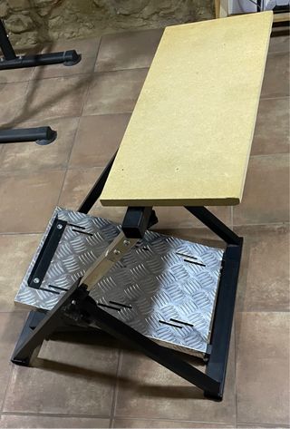 Soporte para volante y pedales de gaming, con base de madera y plataforma para pedales de metal. - Base de madera. - Plataforma de pedales de metal con diseño antideslizante. - Estructura metálica negra. - Ajustes de altura y ángulo.