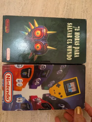 Pack de videos sobre juegos de Nintendo. - Caja de The Legend of Zelda: Majora's Mask para Nintendo 64. - Caja de Game Boy Color con varios mandos de Nintendo 64. - Título en español: 72 Horas para Salvar el Mundo.